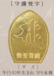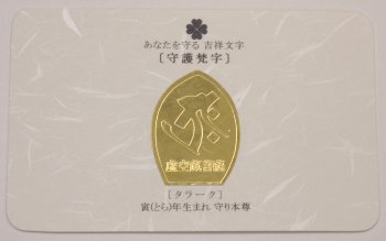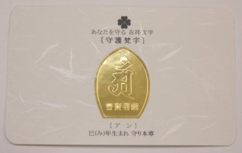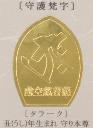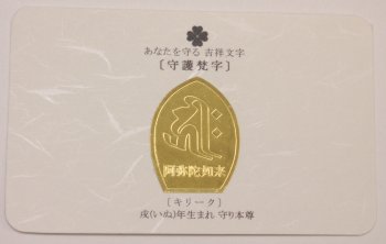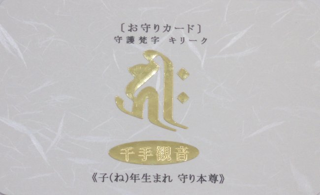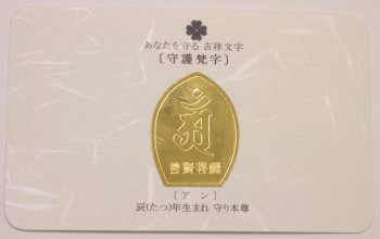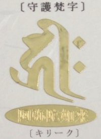 | 《干支(えと)別 守護梵字》 ・子(ね) キリーク 千手観世音菩薩(せんじゅかんぜおんぼさつ) ・丑・寅(うし・とら) タラーク 虚空蔵菩薩(こくぞうぼさつ) ・卯(う) マン 文殊菩薩(もんじゅぼさつ) ・辰・巳(たつ・み) アン 普賢菩薩(ふげんぼさつ) ・午(うま) サク 勢至菩薩(せいしぼさつ) ・未・申(ひつじ・さる) バン 大日如来(だいにちにょらい) ・酉(とり) カーン 不動明王(ふどうみょうおう) ・戌・亥(いぬ・い) キリーク 阿弥陀如来(あみだにょらい) |