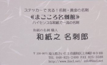 美しい和紙で “おしゃれな” 《和紙の名刺》を お届けしています お店、会社、商品などのPRカードとしても活用いただけます! 本格高級和紙 ( しこくてんれい ) の詳細画像 〔まごころ名刺館〕 |サイトTOPページ|お店の概要|お問い合わせフォーム| TEL 048-825-2400 FAX 048-825-3588 |